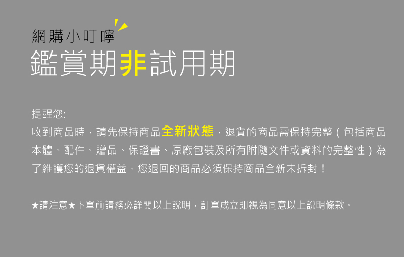 退貨商品須為未經使用,且無非人為瑕疵所造成的污損、故障,消保法保障 7 天鑑賞期僅供您猶豫並確認商品是否符合您的需求,並非商品的試用期;如本商店有提示您者,請保留完整的原始包裝(包括商品本體、配件、贈品、保證書、原廠包裝及所有附隨文件或資料的完整性),否則恕不接受退貨。