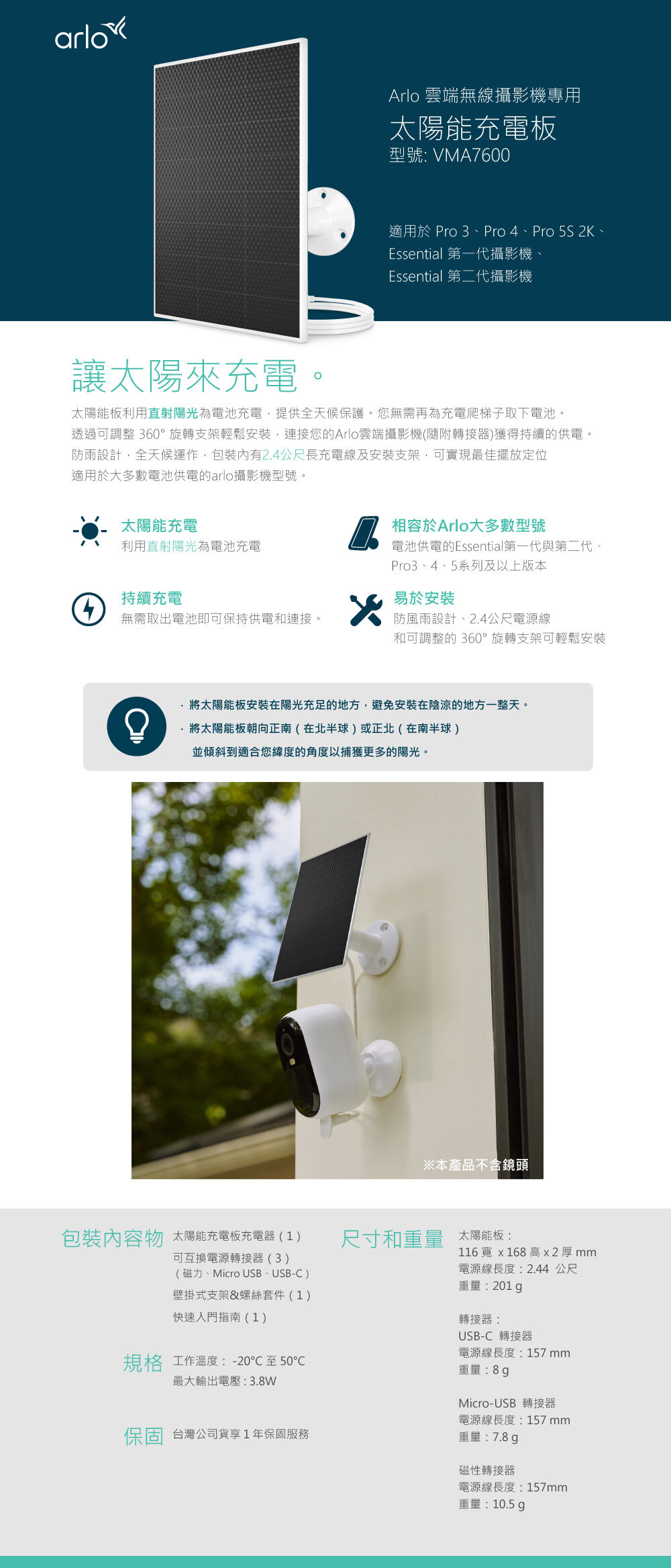 適用型號:Arlo Pro 3 / 4 / 5 及 Essential 一代 / 二代