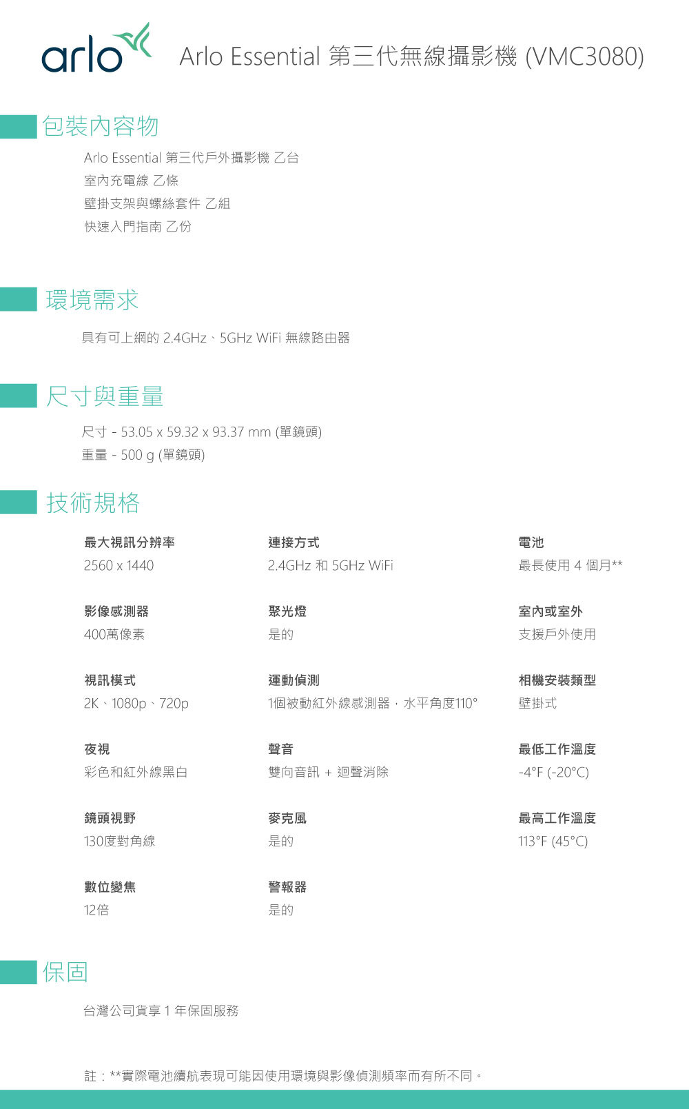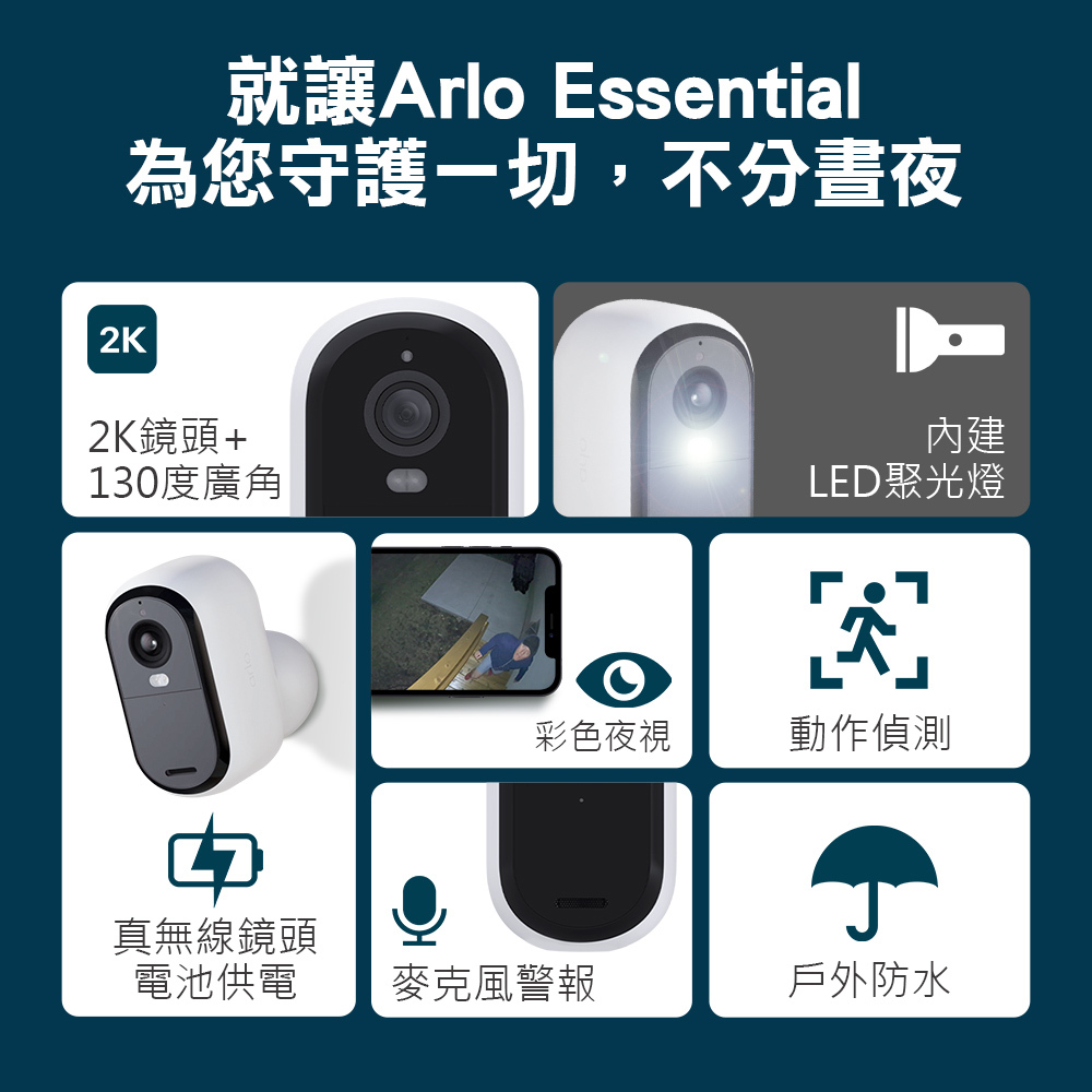 Arlo Essential (VMC3080) 雲端無線 2K WiFi 攝影機 第三代 (單鏡組)